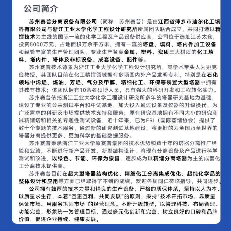 苏州赛普分离设备有限公司专注从事化工填料的研发设计、生产销售和化工运营。年轻、富有活力,注定一开始就是一家具有广阔发展前景的环保新材料企业,我们致力于金属、塑料、陶瓷填料和塔内件及塔设备的应用和推广。公司拥有精良自动化生产设备,专注研发技术团队,提供从图纸设计、成产包装、运输、现场指导安装和售后咨询的全程服务。行业涉及焦化、化肥、石化、盐业、制药、电力、环保等,具有丰富的项目经验。